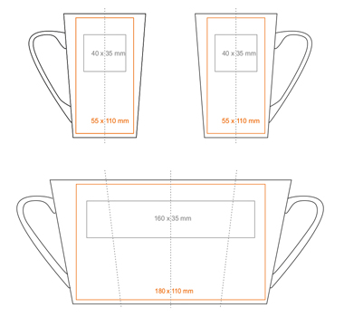Print on the handle (60x10 mm) Print on the inside (50x10 mm) Print on the bottom outside (ø40 mm) Over the rim imprint Hand Made - rim painting Personal print Personalisation engraving |