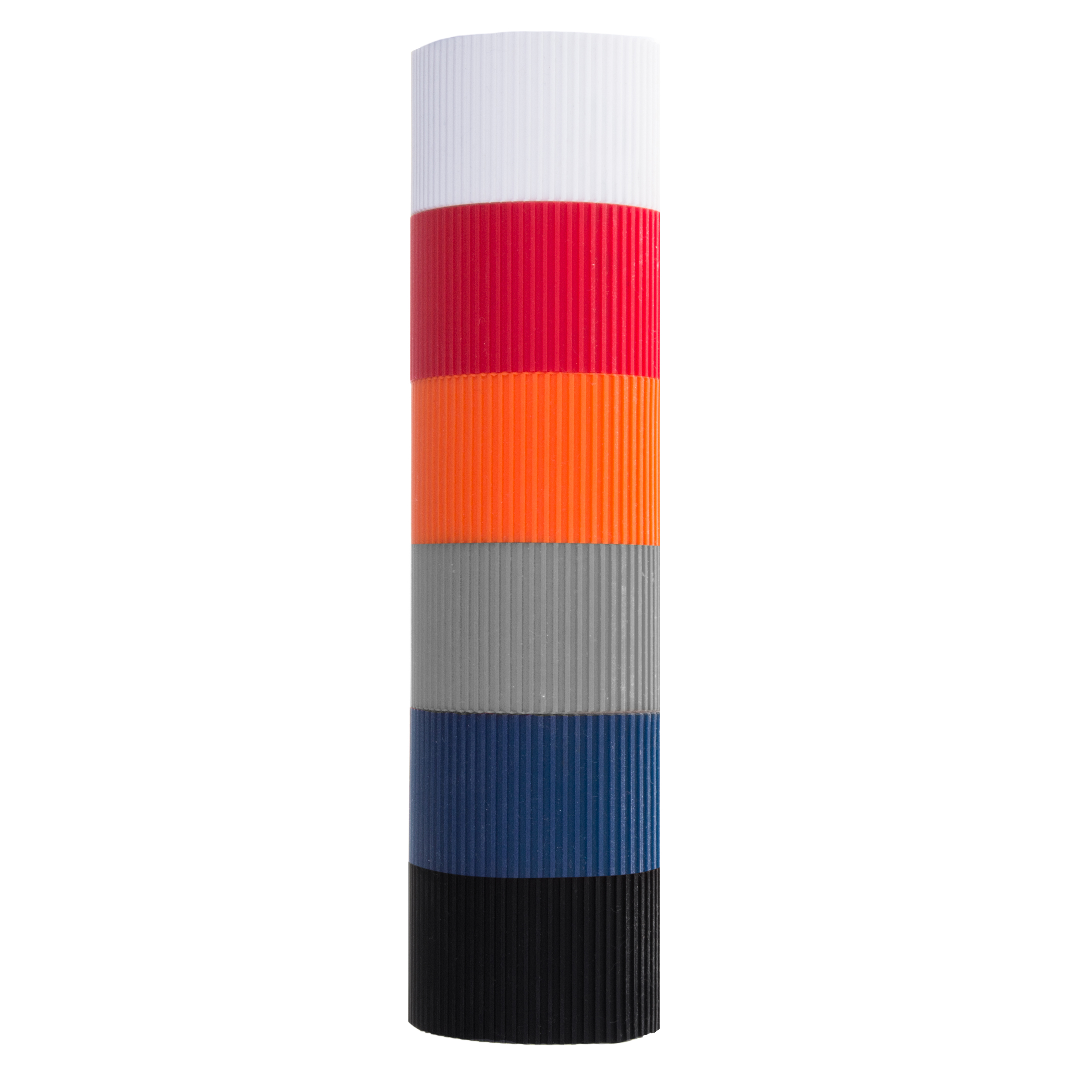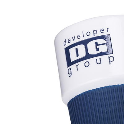 Medium size porcelain advertising mug without handle. The 40mm wide bands are available in 7 colors: white, orange, red, green, navy blue, brown and black.