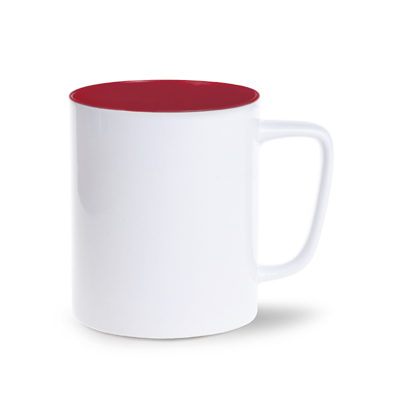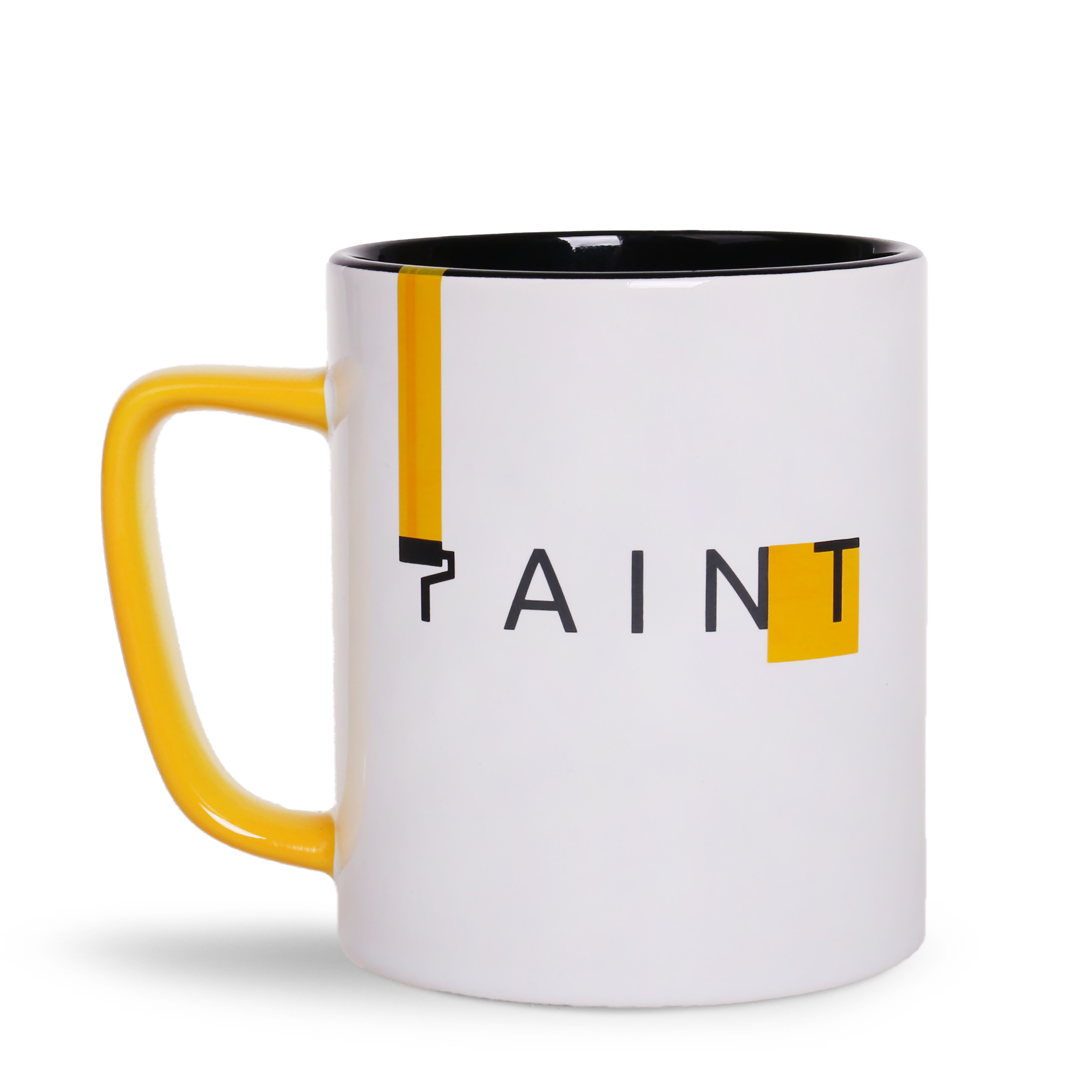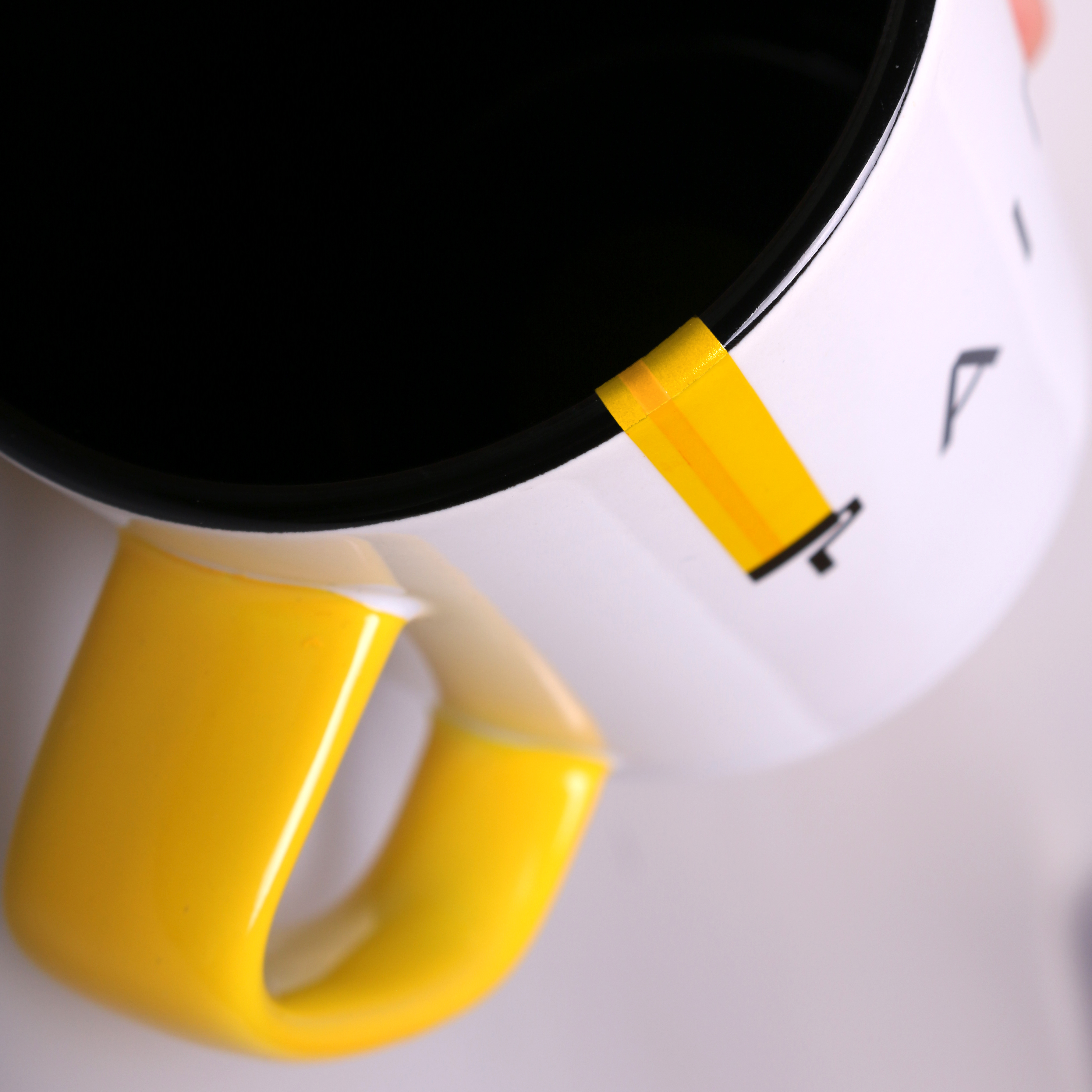 The Tommy mug is a ceramic mug with a characteristic, original shape of the ear, a colorful inside and a white structure on the outside.