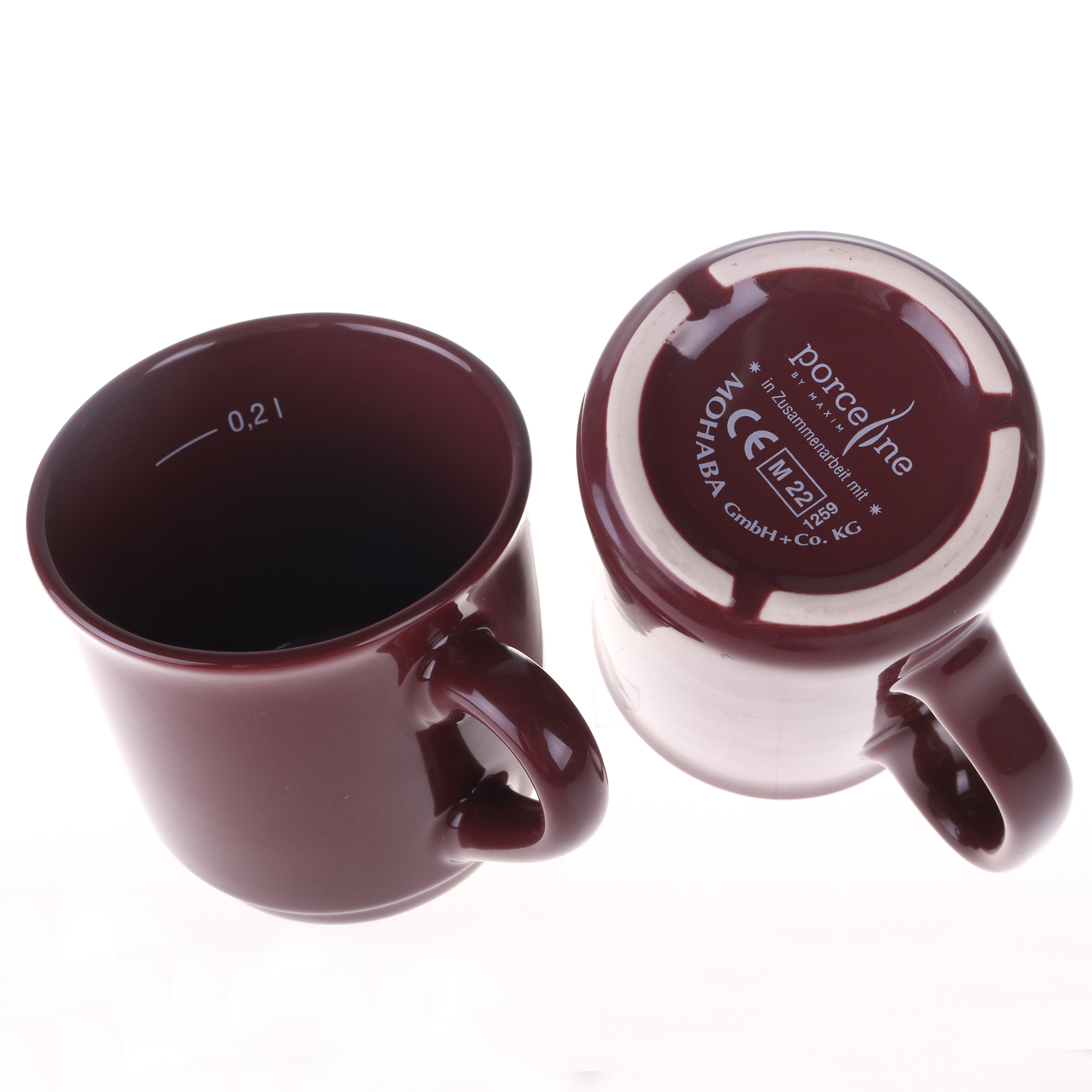 A mug developed for Christmas markets. It has a classic handle shape and a straight body, allowing for stacking. The mug has a trait marker showing the capacity of 200ml and the mark of the entity responsible for marketing. The markings comply with the requirements of the European Union
