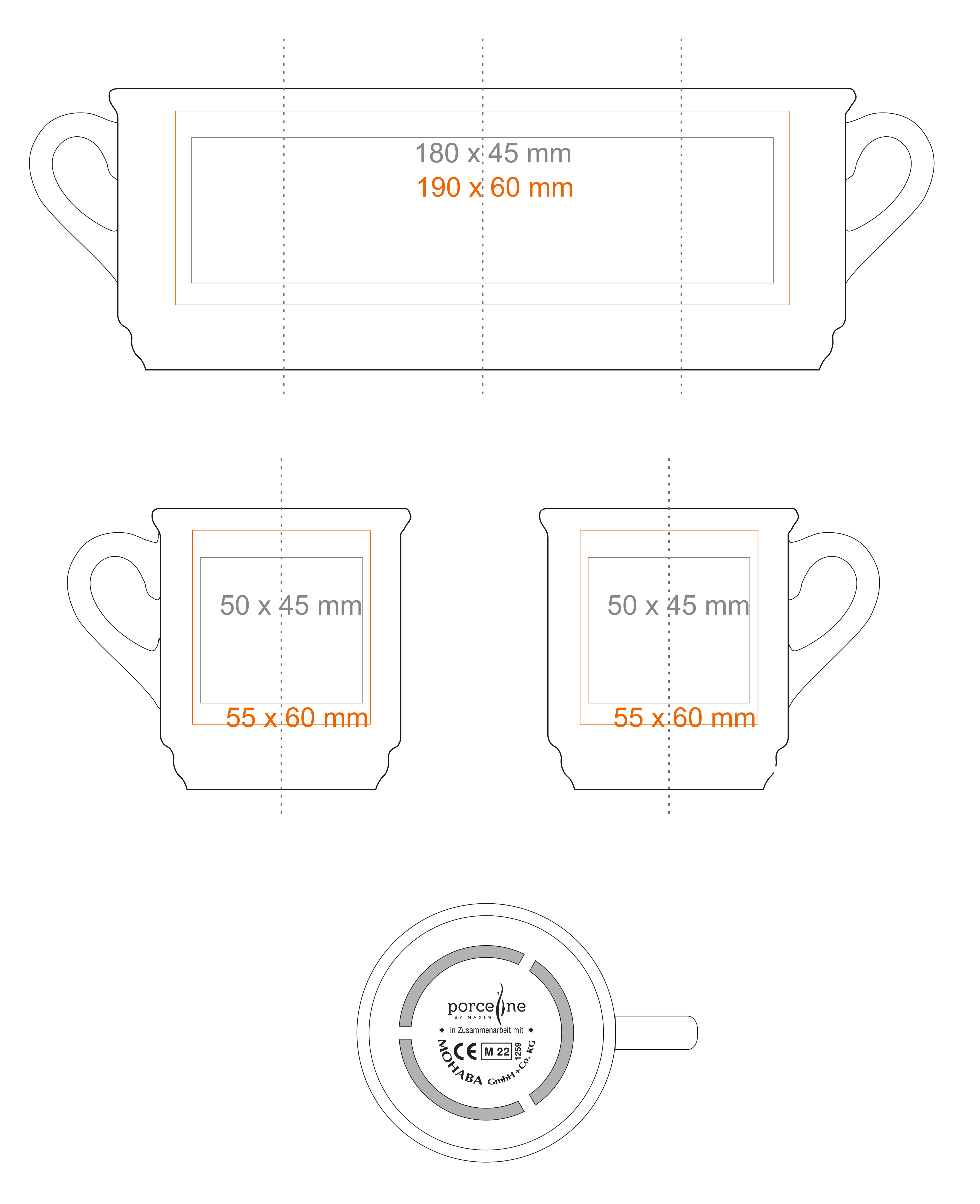 Print on the inside (40x20 mm) Print on the bottom inside (ø30 mm) Gold print Silver print Over the rim imprint Hand Made - rim painting Personal print Personalisation engraving |