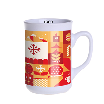 A mug developed for Christmas markets. It has a classic handle shape and a straight body, allowing for stacking. The mug has a trait marker showing the capacity of 200ml and the mark of the entity responsible for marketing. The markings comply with the requirements of the European Union
