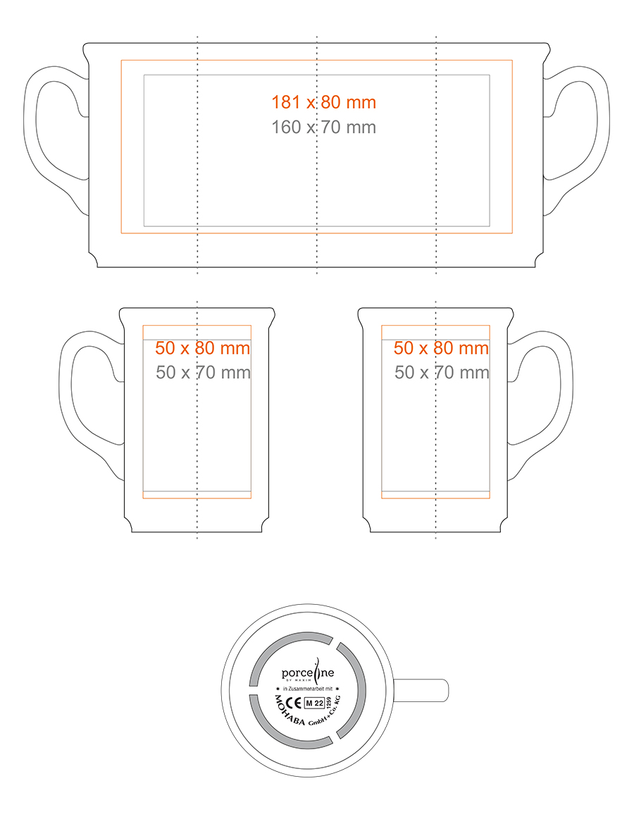 Print on the handle (40x6 mm) Print on the inside (40x20 mm) Gold print Silver print Over the rim imprint Hand Made - rim painting Personal print |