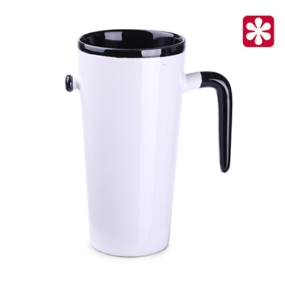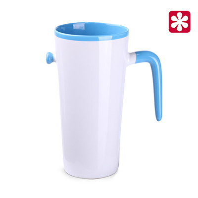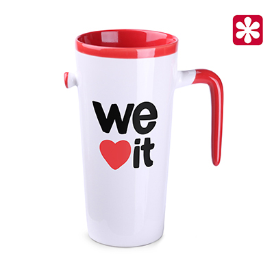 Original and eye-catching mug in five color versions of the interior and handle. The large print area creates a wide range of brand promotion opportunities. This product is from the end of a series and may have pinholes, dots, and variations in glaze shade.