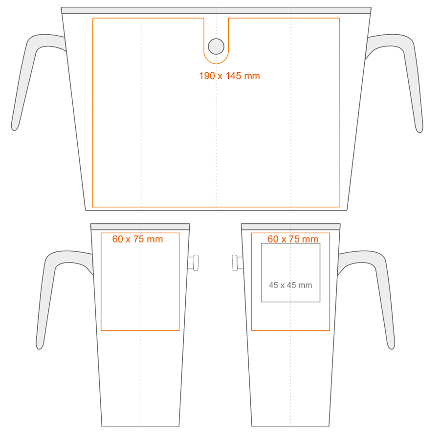 Print on the inside (60x20 mm) Print on the bottom outside (ø45 mm) Gold print Silver print Over the rim imprint Hand Made - rim painting Personal print |