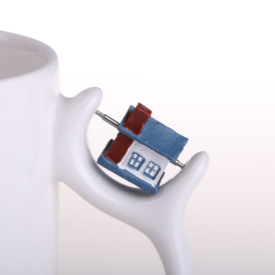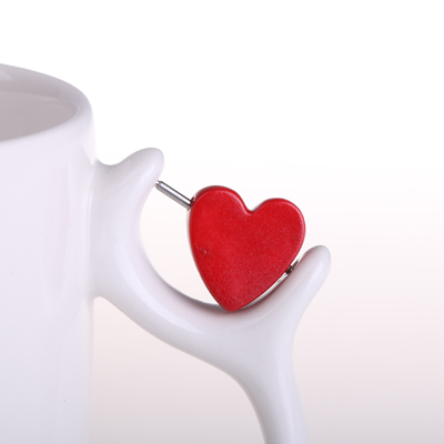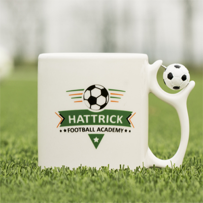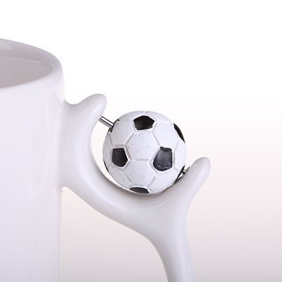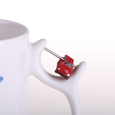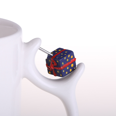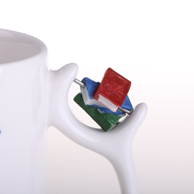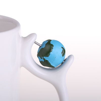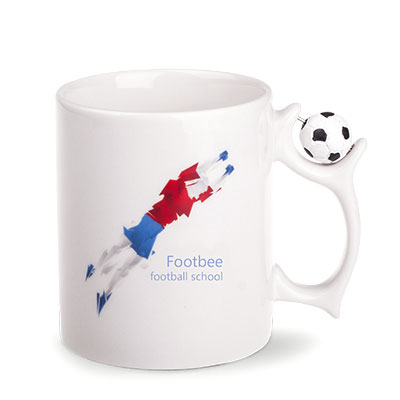 A ceramic advertising mug with a place for an additional gadget in the handle. This product is from the end of a series and may have pinholes, dots, and variations in glaze shade.