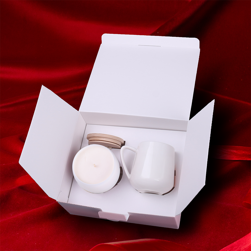 The delicate Eris porcelain mug paired with the customizable, eco-friendly Glamour candle filled with soy wax. The candle features a wooden lid that helps preserve the scent longer, and can also be branded. The set is packed in dedicated eco-friendly Snowy packaging and finished with an elegant personalized band. THE PRESENTED DECORATION IS FOR ILLUSTRATION PURPOSES ONLY AND IS NOT INCLUDED IN THE PRODUCT PRICE. THE SET IS AVAILABLE IN DEDICATEDSNOWY PACKAGING WITH A SELECTED DECORATION OPTION.