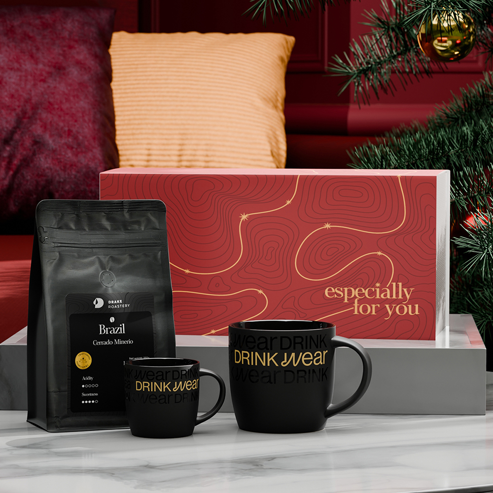 One of the top sales hits – the black matte Handy Supreme mug accompanied by its smaller version, Small, perfect for espresso, and carefully selected Arabica Brazil Cerrado Mineiro coffee beans 250g. The set is packed in dedicated eco-friendly Merry packaging and finished with an elegant personalized band. THE PRESENTED DECORATION IS FOR ILLUSTRATION PURPOSES ONLY AND IS NOT INCLUDED IN THE PRODUCT PRICE. THE SET IS AVAILABLE IN DEDICATED MERRY PACKAGING WITH A SELECTED DECORATION OPTION.