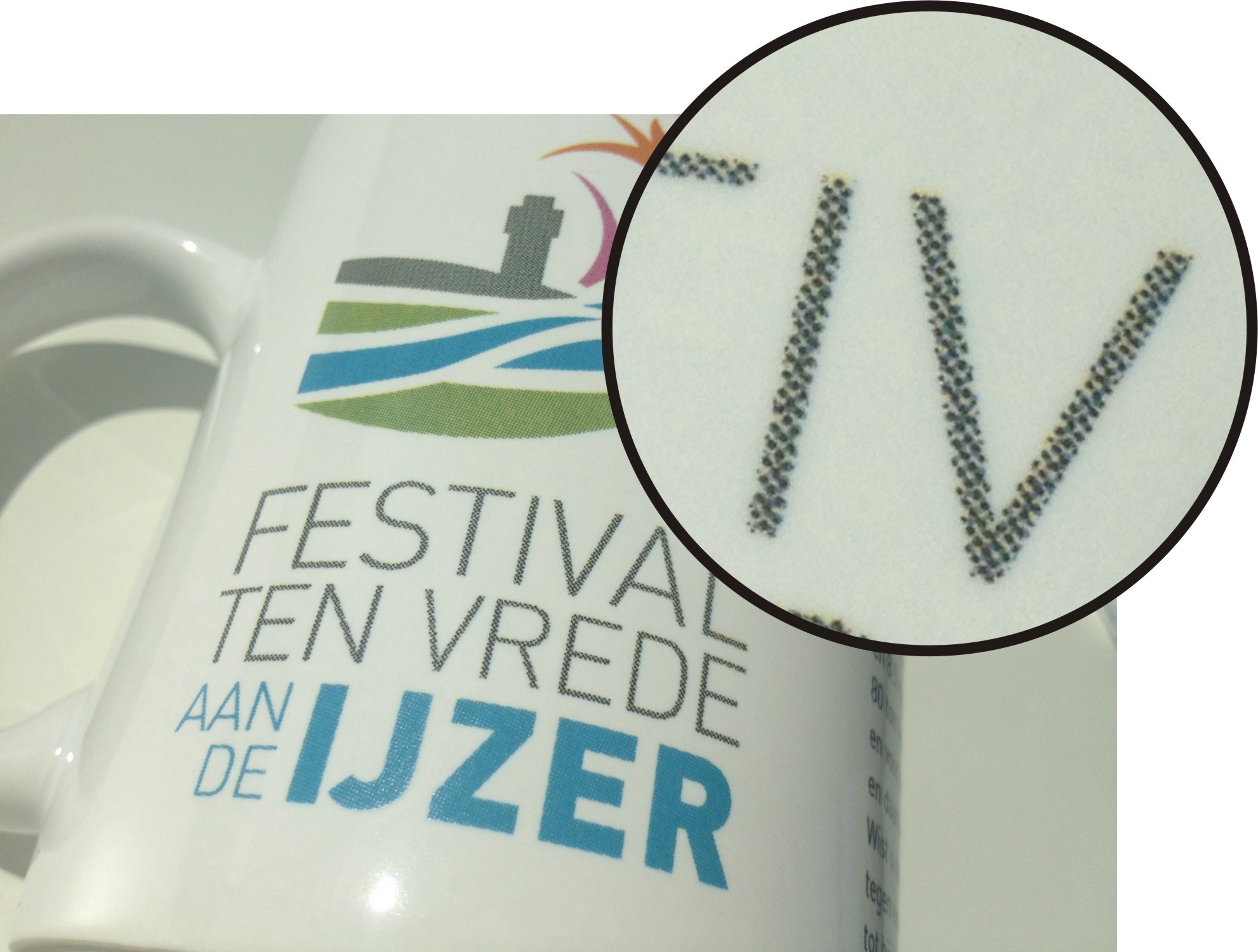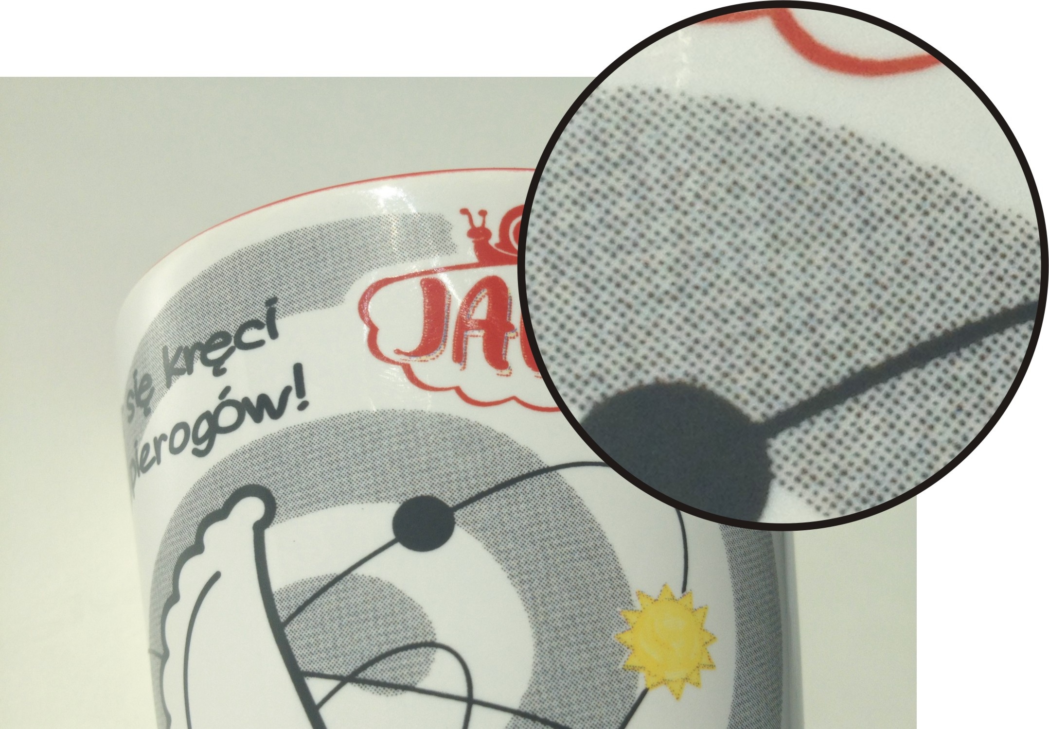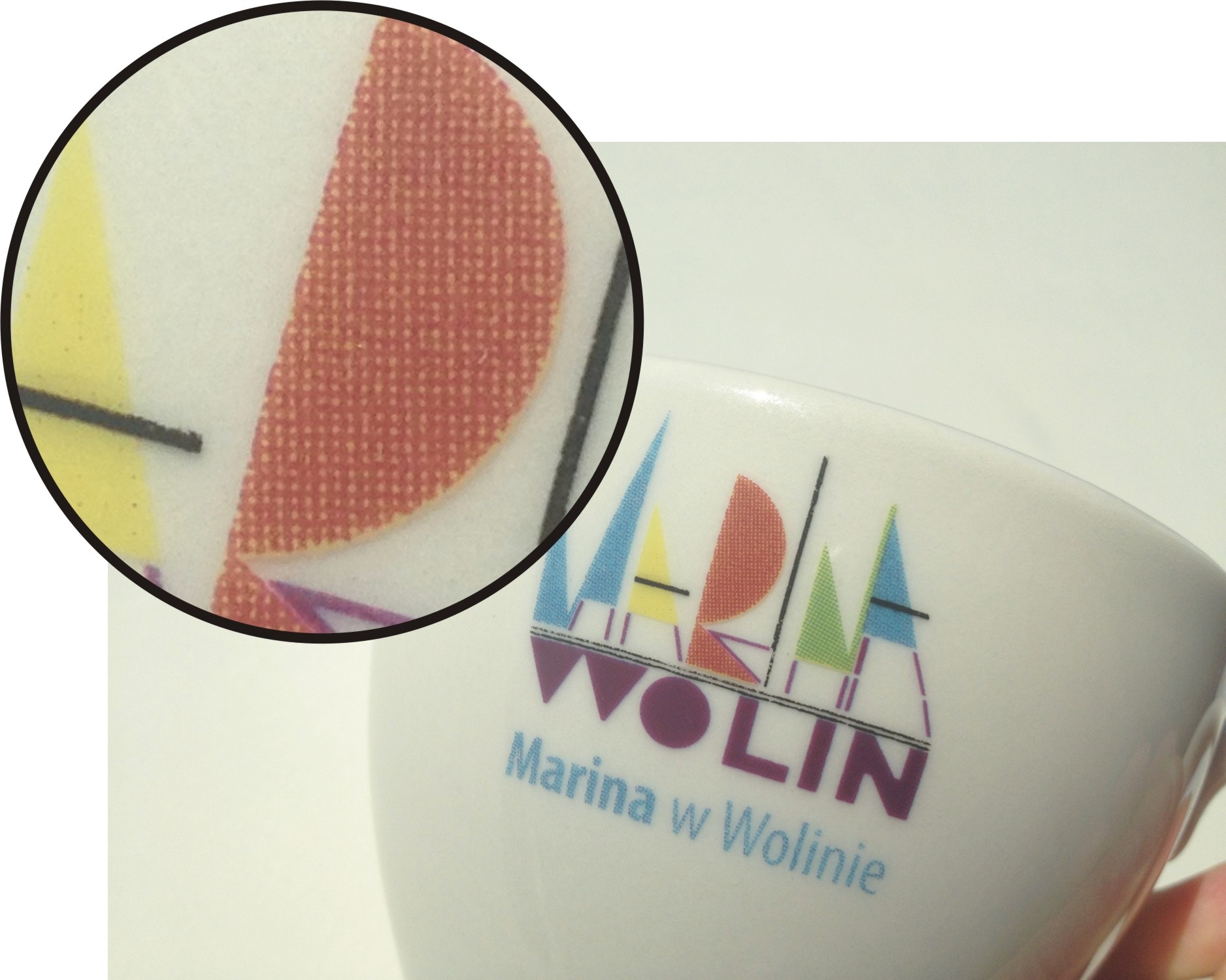 On mugs with CMYK imprint the characteristic dots are visible (especially in close up). Those dots become highly apparent on large, homogenous surfaces.