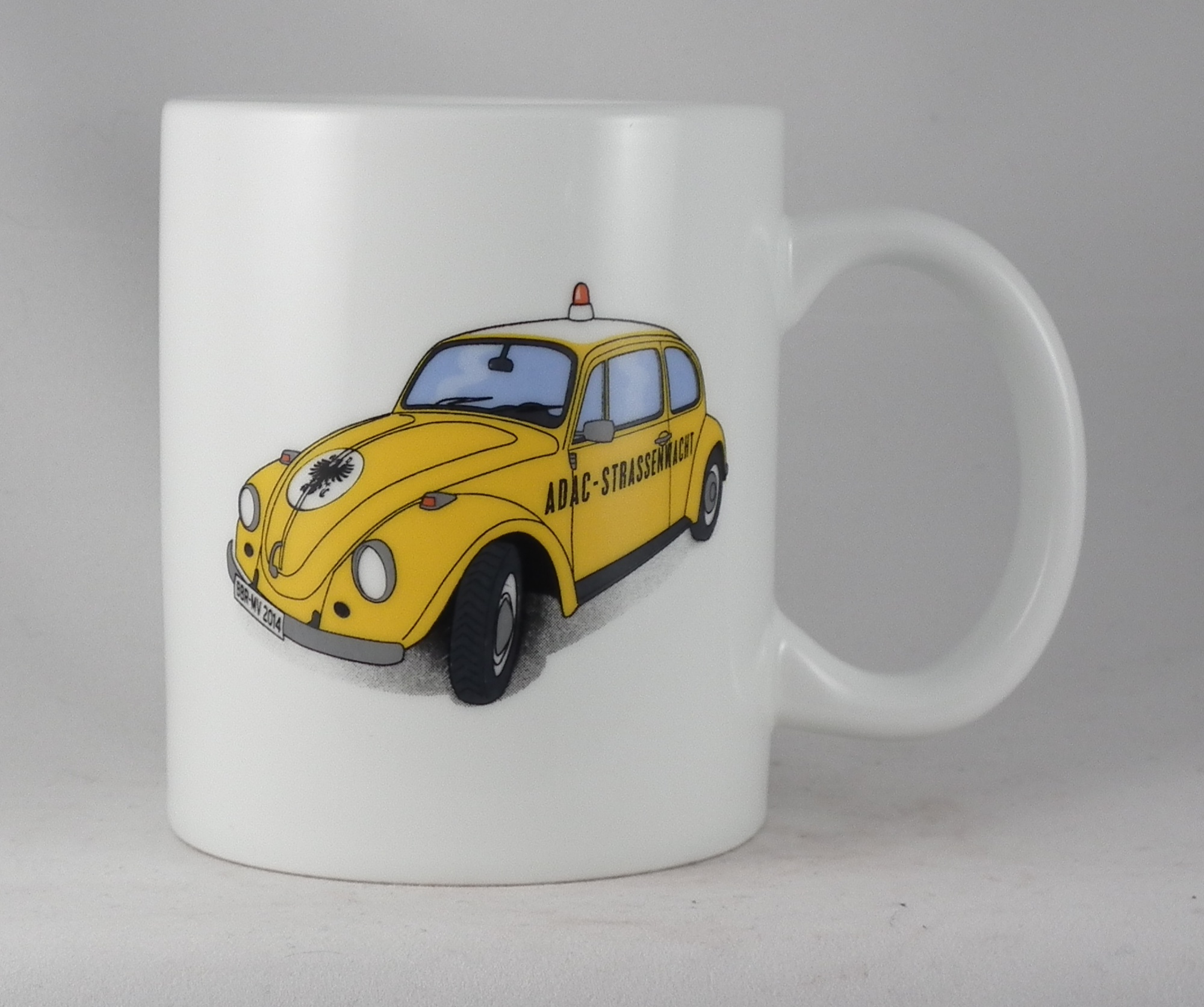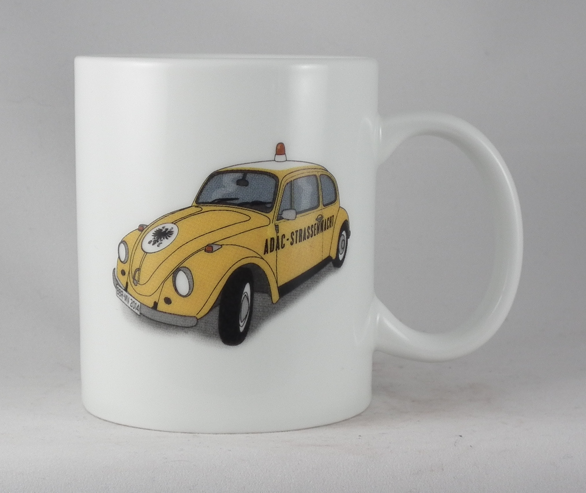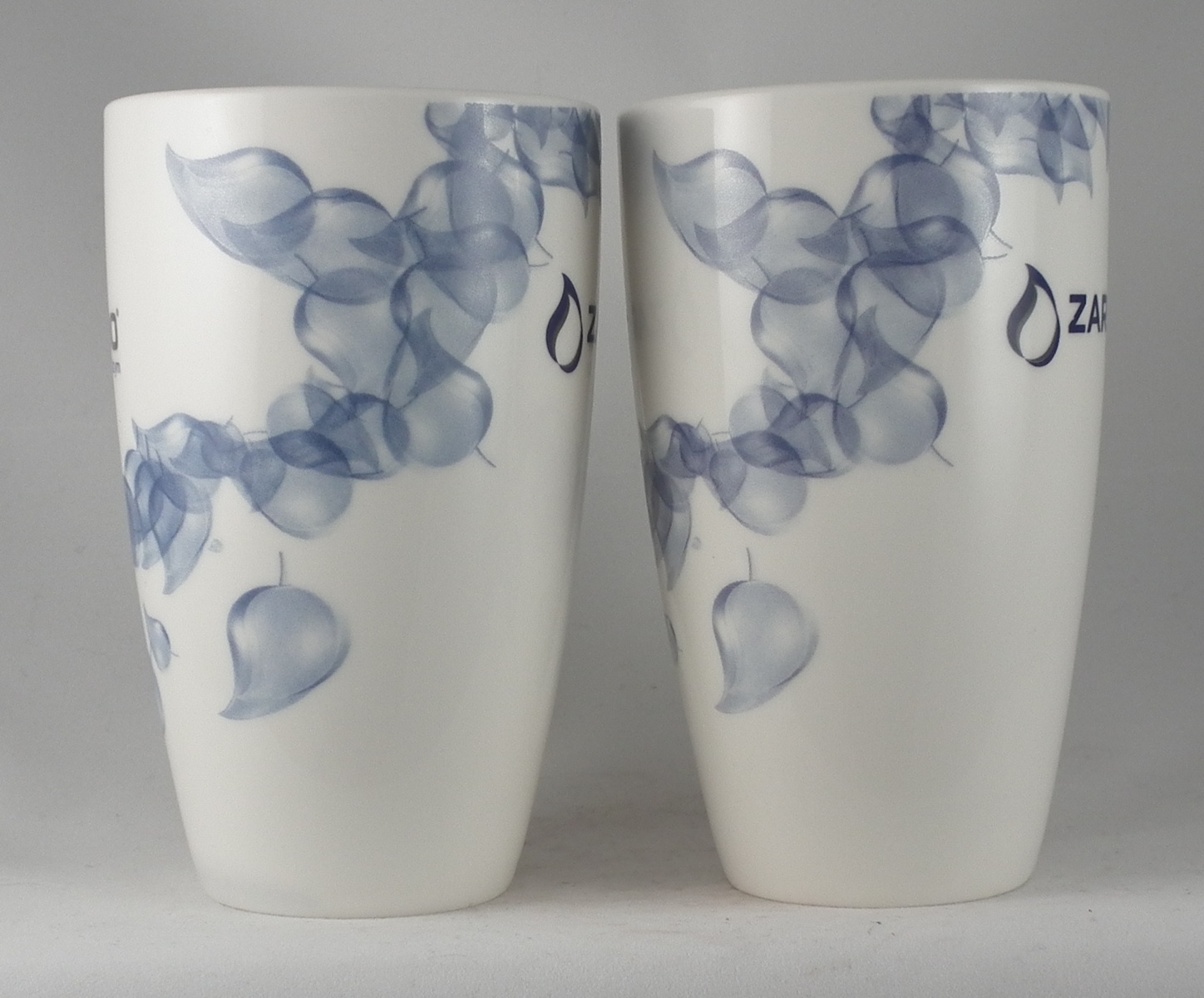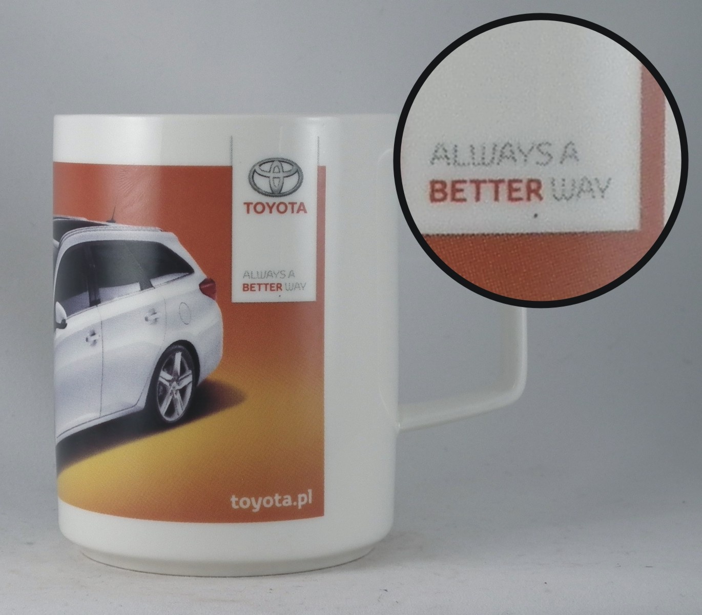 On mugs with CMYK imprint the characteristic dots are visible (especially in close up). Those dots become highly apparent on large, homogenous surfaces.