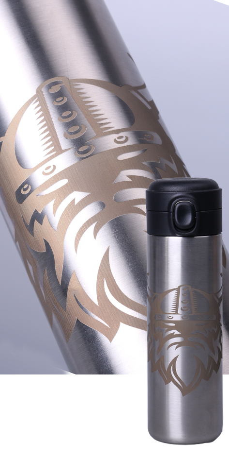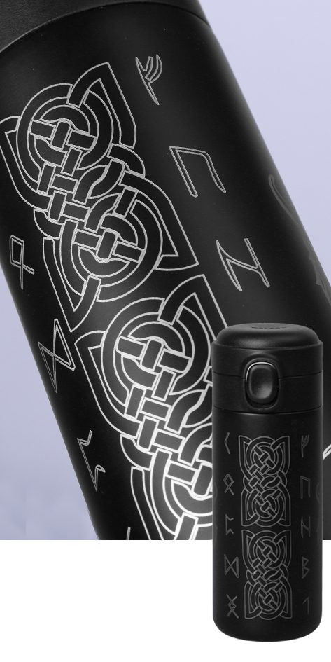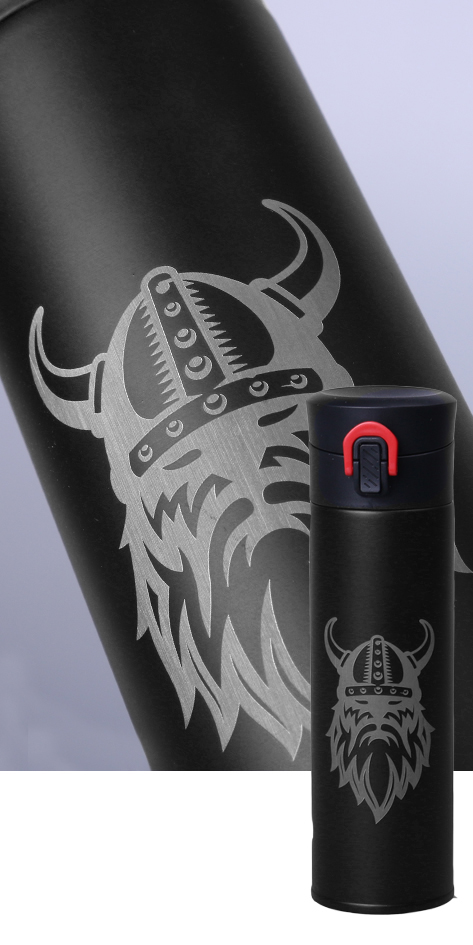Laser engraving is carried out on the metal bodies of Galaxy thermal mugs and bottles, on glass products and on ceramic mugs with coloured glaze.